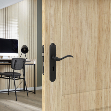 Deurkruk. Type Tiago oud bruin, op langschild met sleutelgat 56mm. De deurklink is vast gemonteerd op het schild en is voorzien van een veer waardoor de kruk niet gaat hangen. In de serie Tiago zijn ook WC 63/8, blind schild en rond rozet beschikbaar. Geen afwijkende maten voor WC, sleutel en cilinder beschikbaar.