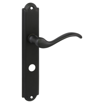 Deurkruk. Type Tiago oud bruin , op langschild voor wc, toilet of badkamer 63mm met stift 8mm. De deurklink is vast gemonteerd op het schild en is voorzien van een veer waardoor de kruk niet gaat hangen. In de serie Tiago zijn ook blind schild, sleutelgat 56mm en een rond rozet beschikbaar. Geen afwijkende maten voor WC, sleutel en cilinder beschikbaar.