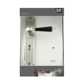 Deurkruk. Type Carlos mat vernikkeld (RVS look) / zwart porselein, op langschild met sleutelgat 56mm. De deurklink is vast gemonteerd op het schild en is voorzien van een veer waardoor de kruk niet gaat hangen. In de serie Carlos zijn ook de WC 63/8, blind schild en vierkant rozet beschikbaar. Het is mogelijk om in de bouwmarkt afwijkende WC, sleutel en cilindermaten te bestellen.