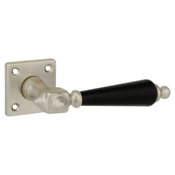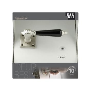Deurkruk type Carlos mat vernikkeld (RVS look) / zwart porselein op vierkant rozet. De deurklink is vast gemonteerd op het rozet en is voorzien van een veer waardoor de kruk niet gaat hangen. Sleutel- en cilinderplaatje en WC garnituur en blind schild, sleutel 56mm en WC 63/8 beschikbaar. Het is mogelijk om in de bouwmarkt afwijkende WC, sleutel en cilindermaten te bestellen. Deze klassieke deurkruk heeft een tijdloos karakter en past bij vrijwel iedere deur!