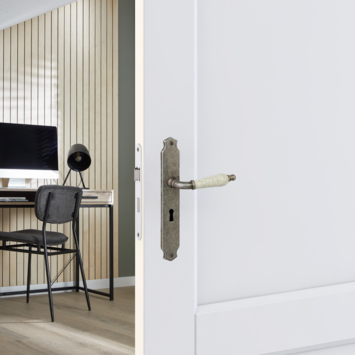 Deurkruk. Type Jon oud tin, op langschild met sleutelgat 56mm. De deurklink is vast gemonteerd op het schild en is voorzien van een veer waardoor de kruk niet gaat hangen. In de serie Jon zijn ook de WC 63/8, blind schild en rond rozet beschikbaar. Het is mogelijk om in de bouwmarkt afwijkende WC, sleutel en cilindermaten te bestellen.