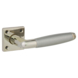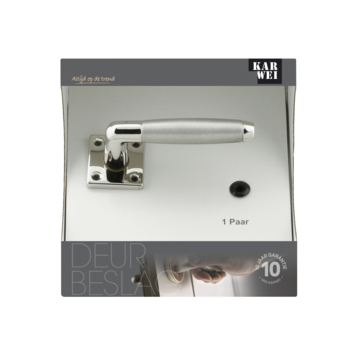 Deurkruk. Type Lopes glans vernikkeld / aluminium, op vierkant rozet. De deurklink is vast gemonteerd op het rozet en is voorzien van een veer waardoor de kruk niet gaat hangen. Sleutel- en cilinderplaatje en WC garnituur en blind schild, sleutel 56mm en WC 63/8 beschikbaar. Het is mogelijk om in de bouwmarkt afwijkende WC, sleutel en cilinder maten te bestellen.