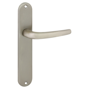 Deurkruk. Type Mario mat vernikkeld (RVS look), op langschild blind (zonder sleutelgat). De deurklink is vast gemonteerd op het schild en is voorzien van een veer waardoor de kruk niet gaat hangen. In de serie Mario zijn ook de WC 63/8, sleutelgat 56mm en rond rozet beschikbaar. Het is mogelijk om in de bouwmarkt afwijkende WC, sleutel en cilindermaten te bestellen.
