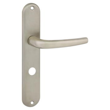 Deurkruk. Type Mario mat vernikkeld (RVS look), op langschild voor wc, toilet of badkamer 63mm met stift 8mm. De deurklink is vast gemonteerd op het schild en is voorzien van een veer waardoor de kruk niet gaat hangen. In de serie Mario zijn ook blind schild, sleutelgat 56mm en rond rozet beschikbaar. Het is mogelijk om in de bouwmarkt afwijkende WC, sleutel en cilindermaten te bestellen.