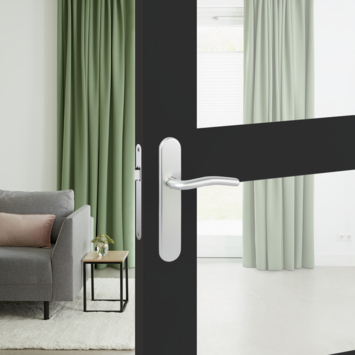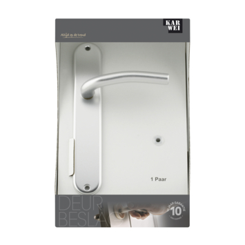 Deurkruk. Type Renato aluminium naturel , op langschild blind (zonder sleutelgat). De deurklink is vast gemonteerd op het schild en is voorzien van een veer waardoor de kruk niet gaat hangen. In deze serie zijn ook de WC 63/8, sleutel 56mm en rond rozet beschikbaar. Het is mogelijk om in de bouwmarkt afwijkende WC, sleutel en cilinder maten te bestellen.