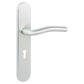 Deurkruk. Type Renato aluminium naturel , op langschild met sleutelgat 56mm. De deurklink is vast gemonteerd op het schild en is voorzien van een veer waardoor de kruk niet gaat hangen. In deze serie zijn ook de WC 63/8, blind schild en rond rozet beschikbaar. Het is mogelijk om in de bouwmarkt afwijkende WC, sleutel en cilindermaten te bestellen.