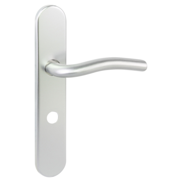 Deurkruk. Type Renato aluminium naturel , op langschild voor wc, toilet of badkamer 63mm met stift 8mm. De deurklink is vast gemonteerd op het schild en is voorzien van een veer waardoor de kruk niet gaat hangen. In deze serie is ook een blind schild, sleutel 56mm en een rond rozet beschikbaar. Het is mogelijk om in de bouwmarkt afwijkende WC, sleutel en cilindermaten te bestellen.