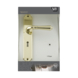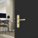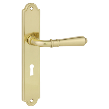 Deurkruk. Type Rui glans messing, op langschild met sleutelgat 56mm. De deurklink is vast gemonteerd op het schild en is voorzien van een veer waardoor de kruk niet gaat hangen. In deze serie zijn ook de WC 63/8, blind schild en rond rozet beschikbaar. Het is mogelijk om in de bouwmarkt afwijkende WC, sleutel en cilindermaten te bestellen.