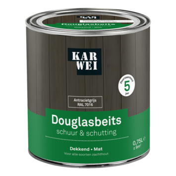 KARWEI douglasbeits schuur & schutting mat RAL 7016 antraciet grijs 750 ml is een dekkende beits op waterbasis. Ideaal voor het behandelen van fijn bezaagd of glad geschaafd douglas, grenen, vuren, lariks en alle andere soorten zachthout. KARWEI Douglasbeits dringt goed in het hout en maakt het hout sterk vochtregulerend, weerbestendig en waterafstotend. Dekkende beits dekt de houtnerf af, maar blijft wel vochtregulerend. Voorbehandelen met grondverf is niet nodig.