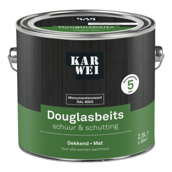 KARWEI douglasbeits schuur & schutting mat RAL 9005 monumentenzwart 2,5 liter is een dekkende beits op waterbasis. Ideaal voor het behandelen van fijn bezaagd of glad geschaafd douglas, grenen, vuren, lariks en alle andere soorten zachthout. KARWEI Douglasbeits dringt goed in het hout en maakt het hout sterk vochtregulerend, weerbestendig en waterafstotend. Dekkende beits dekt de houtnerf af, maar blijft wel vochtregulerend. Voorbehandelen met grondverf is niet nodig.