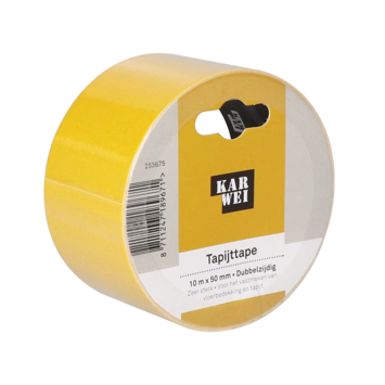 KARWEI dubbelzijdig tapijtband 50 mm x 10 m is een dubbelzijdige tape voor binnengebruik die je gebruikt om tapijt of vloerbedekking vast te plakken op een vlakke ondergrond. De tape is gemaakt van kunststof en voorkomt dat tapijt of tapijttegels verschuiven tijdens gebruik. Je brengt hem eenvoudig aan tussen vloer en bekleding en verwijdert hem later weer zonder lijmresten.