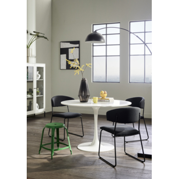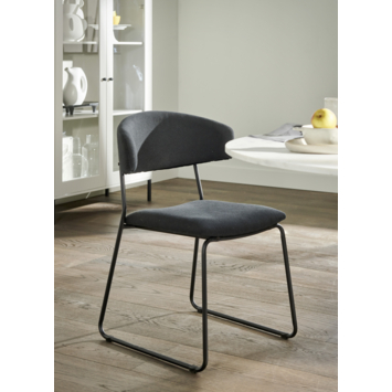 Eetkamerstoel Juul is een stoel met een metalen frame en een gestoffeerde zit-de en rugdeel in een antraciet kleur. Dankzij de vriendelijke vormen en de fijne stof is de Juul een smaakvolle toevoeging aan je eetkamertafel. Heel mooi aan een bureau of juist aan een lichte of donkere eetkamertafel. De stoel heeft een hoogte van 79cm en een zit breedte van 55,5cm. De Juul heeft een actieve en stevige zit. De eetkamerstoel is ook verkrijgbaar in beige en zwart.