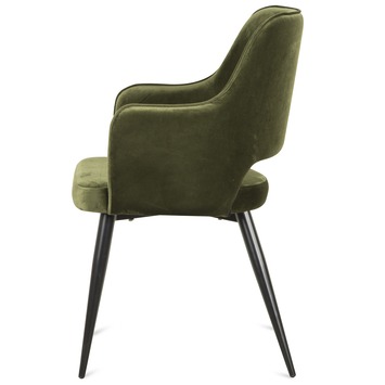 De KARWEI eetkamerstoel Puck bladgroen polyester stof met armleuning is een tijdloze en elegante toevoeging aan jouw eetkamer. De stoel is bekleed met een zachte polyester stof met fluweel look, wat zorgt voor een luxe uitstraling en een comfortabele zit. De diepe bladgroene kleur geeft de stoel een sfeervolle en eigentijdse touch, terwijl de zwarte poten zorgen voor een stoer contrast dat eenvoudig te combineren is met diverse interieurstijlen.