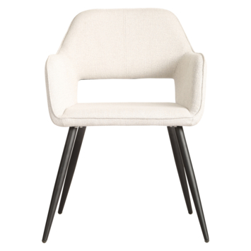 De KARWEI eetkamerstoel Vera zand gemêleerd stof met armleuning is een stijlvolle en comfortabele stoel die jouw eetkamer een moderne en sfeervolle uitstraling geeft. De gemêleerde zandkleurige bekleding zorgt voor een warme en tijdloze look, terwijl de vier zwarte metalen poten de stoel een stoer en eigentijds karakter geven. Dankzij de armleuningen en de comfortabele stoffering is Vera ideaal voor lange diners of gezellige avonden aan tafel.