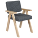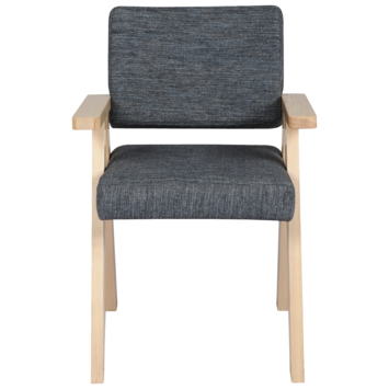 Eetkamerstoel Yves is gestoffeerd in een antraciete stof met naturel armleuningen en stoelpoten. De stoel heeft een unieke uitstraling en staat leuk in meerdere ruimtes in het huis.