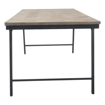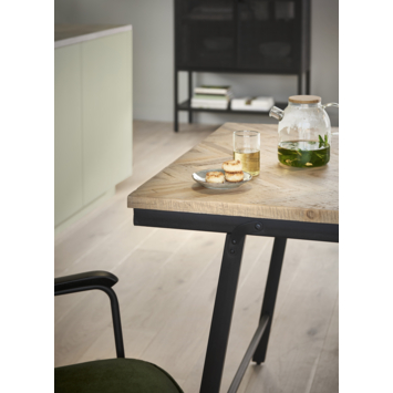 De KARWEI eettafel Mateo visgraat teakhout 200 x 90 cm is een stoere en stijlvolle tafel die direct sfeer toevoegt aan de eetkamer. Het tafelblad is uitgevoerd in een prachtig visgraatmotief en gemaakt van gerecycled teakhout, wat elk exemplaar uniek maakt. In combinatie met het zwarte metalen frame en de stevige metalen poten krijgt de tafel een industriële uitstraling die perfect past in zowel moderne als landelijke interieurs. Met royale afmetingen van 200 x 90 cm en een hoogte van 78 cm is er voldoende ruimte om met familie en vrienden te genieten van lange diners. Het blad heeft bovendien een robuuste dikte van 3 cm, wat de tafel extra karakter geeft.