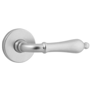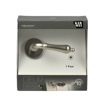 Deurkruk. Type Figo mat vernikkeld (RVS look), op rond rozet. De deurklink is vast gemonteerd op het rozet en is voorzien van een veer waardoor de kruk niet gaat hangen. In de serie Figo zijn ook de WC 63/8, blind schild en sleutelgat 56mm beschikbaar. Eveneens zijn er bijpassende cilinder -en sleutelplaatjes en wc garnituur te verkrijgen. Het is mogelijk om in de bouwmarkt afwijkende WC, sleutel en cilinder maten te bestellen.