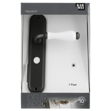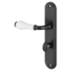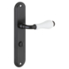 Deurkruk. Type Franco oud bruin / wit porselein, op langschild voor wc, toilet of badkamer 63mm met stift 8mm. De deurklink is vast gemonteerd op het schild en is voorzien van een veer waardoor de kruk niet gaat hangen. In de serie Franco zijn ook blind schild, sleutelgat 56mm en rond rozet beschikbaar. Geen afwijkende maten voor WC, sleutel en cilinder beschikbaar.