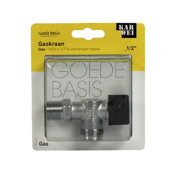 De KARWEI gaskraan met buitendraad en haakse uitloop mat chroom m24 x 1/2 inch bestaat uit twee verschillende aansluitingen, aangezien er een verloop nodig is om de Nederlands m24 gasslangen te kunnen koppelen aan het gasfornuis met de aansluiting 1/2 inch.