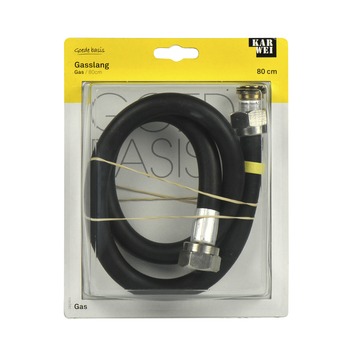 De KARWEI gasslang m24 80 cm zwart komt tussen de gasleiding en het gasfornuis. De gasslang heeft de standaard Nederlandse maat m24. Deze maat past niet op het gasfornuis, dus er moet nog een koppelstuk tussen gezet worden. De gasslang heeft een lengte van 80 centimeter.