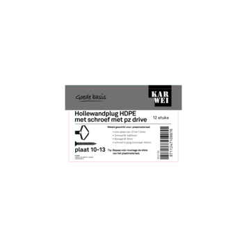 De KARWEI Hollewandplug PE plaat 10-13 met schroef gebruik je voor het bevestigen van voorwerpen in gipsplaten en ander plaatmateriaal. Een hollewandplug heeft grote anti-rotatievleugels waardoor de plug niet meedraait wanneer je er een schroef indraait. Deze verpakking bevat 12 hollewandpluggen. Voor dit item adviseren wij een schroef te gebruiken met Ø 0 en een lengte van 45mm
