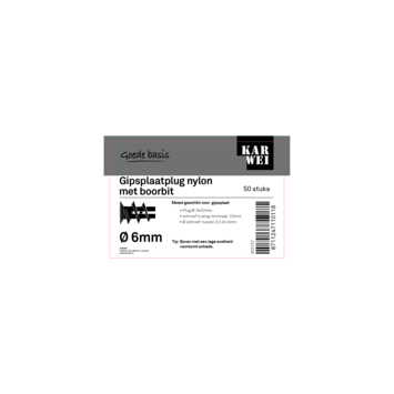 De KARWEI-gipsplaatplug met bit, is geschikt voor het bevestigen van lichte materialen aan gipsplaten. Denk aan fotolijstje, schilderijen, sleutelkastjes, schakelaars en plinten. Je kunt de gipsplaatpluggen met maximaal 11 kg belasten, afhankelijk van het materiaal. Met behulp van het meegeleverde indraaihulpstuk, het bit, monteer je de plug. Zodra de plug in de gipsplaat is gedraaid, schroef je er een passende schroef in. Let erop dat schroeven de lengte van de plug hebben plus de materiaaldikte.
