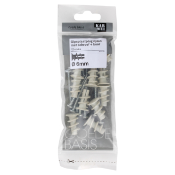 De KARWEI Gipsplaatplug nylon Ø 6mm met schroef is geschikt voor het bevestigen van lichte materialen in gipsplaten. Denk aan fotolijstje, schilderijen, lampen, en elektrische installaties. Met behulp van de handige boorpunt monteert u de pluggen snel en eenvoudig. Zodra de metalen plug van 30mm lang in de gipsplaat is gedraaid, schroeft u er een passende schroef in. Met deze verpakking wordt per plug een 4x40mm cilinderkop schroef meegeleverd. Een verpakking bevat 12 pluggen en schroeven.