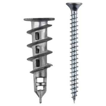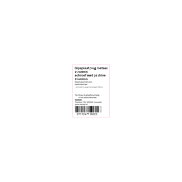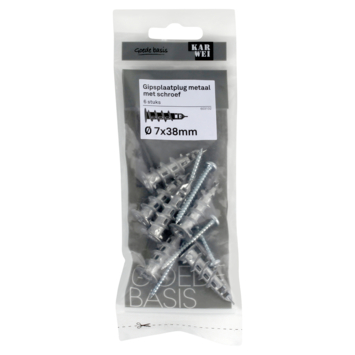 De KARWEI Gipsplaatplug metaal Ø 7mm met schroef is geschikt voor het bevestigen van lichte materialen in gipsplaten. Denk aan fotolijstje, schilderijen, lampen, en elektrische installaties. Met behulp van de handige boorpunt monteert u de pluggen snel en eenvoudig. Zodra de metalen plug van 30mm lang in de gipsplaat is gedraaid, schroeft u er een passende schroef in. Met deze verpakking wordt per plug een 4x40mm verzonkenkop schroef meegeleverd. Een verpakking bevat 6 pluggen en schroeven.