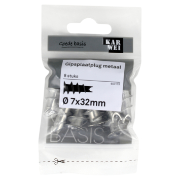 De KARWEI Gipsplaatplug metaal Ø 7mm is geschikt voor het bevestigen van lichte materialen in gipsplaten. Denk aan fotolijstje, schilderijen, lampen, en elektrische installaties. Met behulp van de handige boorpunt monteert u de pluggen snel en eenvoudig. Zodra de metalen plug van 20mm lang in de gipsplaat is gedraaid, schroeft u er een passende schroef in. Voor het beste resultaat adviseren wij schroeven te gebruiken van tussen 4 en 5mm met een lengte van 30mm De gipsplaatpluggen van metaal van Karwei koopt u per verpakking van 8 stuks.