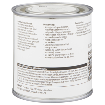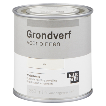 De Karwei grondverf is een uitstekende basis voor mooi en kwalitatief goed schilderwerk buitenshuis. Je beschermt het houtwerk, plaatmateriaal, bestaand schilderwerk en voorbehandeld metaal buitenshuis optimaal door de ondergrond voor te behandelen met deze grondverf. Door het gebruik van Karwei grondverf op terpetinebasis hecht de afwerklaag beter en je krijgt een mooier eindresultaat met een goede en egale dekking. Het is een terpetinegedragen verf, makkelijk schuurbaar en goed vullend, daardoor is dit de ideale grondverf voor al het houtwerk buitenshuis. De grondverf is na drie uur stofdroog en na 20 uur overschilderbaar. De verf kan je het beste verwerken bij een temperatuur rond de 20°C, maar in ieder geval tussen de 8 en 25°C. Schilder niet in de felle zon en bij regenachtig weer. Werk het liefst bij daglicht om geen stukjes oppervlak te missen. Schilder hout altijd in de richting van de houtnerf. De grondverf is eenvoudig aan te brengen met een kwast of lakroller voor verf op terpetinebasis.