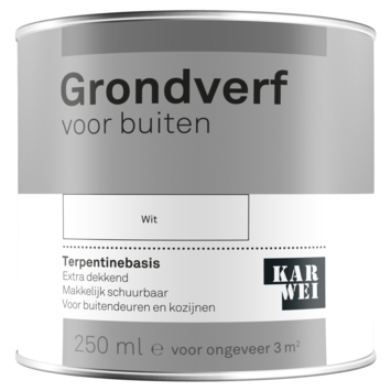 Grondverf op terpentinebasis voor buiten. Ideaal voor het schilderen van hout, plaatmateriaal, bestaand schilderwerk en voorbehandeld metaal. De grondverf is goed dekkend en makkelijk schuurbaar en zorgt voor een uitstekende hechting voor afwerking met KARWEI Buitenlak op terpentinebasis. KARWEI Grondverf vormt de basis voor een perfect eindresultaat.