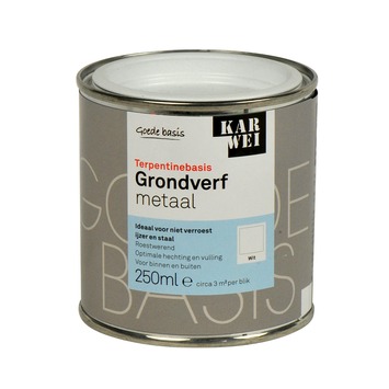 De KARWEI grondverf metaal wit 250 ml zorgt voor een optimale vulling en hechting op ijzer en staal. Daarnaast heeft de grondverf ook een roestwerende werking. De grondverf op terpentinebasis kun je zowel binnenshuis als buitenshuis gebruiken. Het blik bevat 250 milliliter witte grondverf, die is genoeg voor een oppervlakte van zo'n 3 vierkante meter. De grondverf kan eenvoudig worden aangebracht met een kwast of roller.