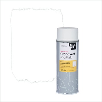 De KARWEI grondverf spuitlak wit 400 ml is een goed dekkende verspuitbare grondverf voor hout, metaal, kunststof en keramische materialen. De spuitlak is met name geschikt voor moeilijk te schilderen oppervlakten zoals buizen, rotan en spijlen. De lak op thinnerbasis is sneldrogend, na 10 minuten is het al over te spuiten met een volgende laag. De spuitbus bevat 400 milliliter witte spuitlak, dit is genoeg voor een oppervlakte van zo'n 2 vierkante meter per laag.