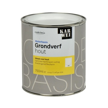 De KARWEI grondverf waterbasis hout wit 750 ml zorgt voor een optimale dekking, vulling en egalisering van een houten ondergrond. De grondverf zorgt ervoor dat de volgende verflagen egaal kunnen worden aangebracht zonder dat de eindlaag in het hout trekt. De grondverf op waterbasis droogt snel en is reukarm. Het is al overschilderbaar na 6 uur. Je kunt de grondverf zowel binnenshuis als buitenshuis gebruiken. Het blik bevat 750 milliliter witte grondverf, dit is genoeg voor een oppervlakte van zo'n 11 vierkante meter. De grondverf kan eenvoudig worden aangebracht met een kwast of roller.