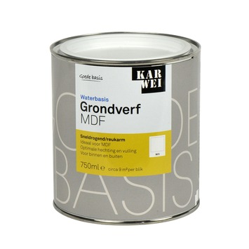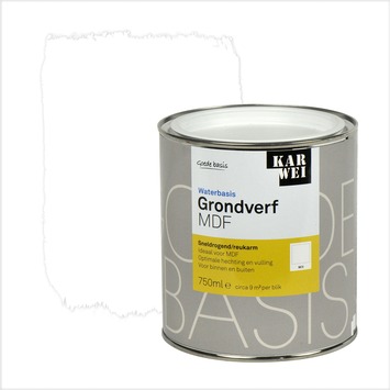 De KARWEI grondverf waterbasis MDF wit 750 ml is de ideale grondverf voor MDF, HDF en OSB platen. De grondverf heft de zuigende werking op van deze materialen en zorgt ervoor dat de volgende verflagen er beter op hechten. De grondverf op waterbasis droogt snel en is reukarm. Het is al overschilderbaar na 4 uur. De grondverf is zowel geschikt voor gebruik binnenshuis als buitenshuis. Het blik bevat 750 milliliter witte grondverf, dit is genoeg voor een oppervlakte van zo'n 9 vierkante meter. De grondverf kan eenvoudig worden aangebracht met een kwast of een roller.