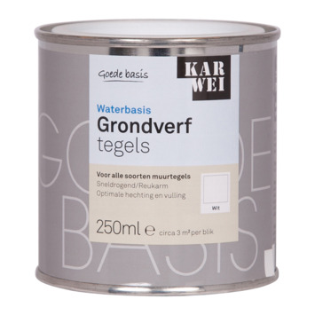 De KARWEI grondverf waterbasis tegels wit 250 ml zorgt voor een uitstekende hechting en vulling van tegels. De grondverf is met name geschikt voor tegels in de keuken en het toilet. De grondverf is minder geschikt voor tegels in de badkamer, vooral op plekken die regelmatig worden belast met warm water. De grondverf op waterbasis droogt snel en is reukarm. Het is al overschilderbaar na 4 uur. De tegels kunnen na het aanbrengen van de grondverf worden overgeschilderd met iedere gewenste kleur KARWEI extra dekkende lak op terpentinebasis of waterbasis. Het blik bevat 250 milliliter witte grondverf, dit is genoeg voor een oppervlakte van zo'n 3 vierkante meter. De grondverf kan eenvoudig worden aangebracht met een kwast of roller.