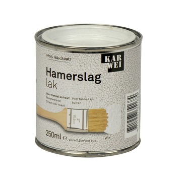 De KARWEI hamerslag lak roestwerend wit 250 ml is een metaallak met hamerslageffect. De lak kan direct worden aangebracht op metaal, zoals hekwerk, meubels en speelgoed. De lak is ook geschikt voor hout. Het is een grondverf en lak in één. Daarnaast is de lak roestwerend, waterafstotend, kras- en stootvast en lood- en chroomaatvrij. Je kunt de lak zowel binnen- als buitenshuis gebruiken. De lak is gemakkelijk aan te brengen en heeft een uitstekende hechting. Het blik bevat 250 milliliter witte lak, dit is genoeg voor het lakken zo'n 2,5 vierkante meter. De KARWEI hamerslag lak is ook in andere kleuren verkrijgbaar.