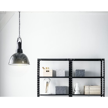 Hanglamp Brent is een industriële lamp met een moderne touch. Waar de zwarte metalen kap met kettingsnoer de lamp een stoer uiterlijk geeft, zorgen de glans en de detaillering voor net dat beetje extra. De glasplaat aan de onderzijde van de lamp zorgt voor prachtig diffuus licht. De kap heeft een diameter van 40cm en het kettingsnoer maakt het erg eenvoudig om deze lamp in hoogte te verstellen. Hanglamp Brent is ook verkrijgbaar in de kleuren grijs en verweerd grijs.