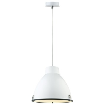 De KARWEI hanglamp Factory mat wit is een moderne hanglamp met een diameter van 43 cm. De mat wit afgewerkte kap van aluminium heeft een modern en industrieel uiterlijk. De lamp bevat een gematteerde glasplaat die met drie clips bevestigd is aan de kap. Het licht uit de lamp wordt zo op een diffuse manier verspreid. Daarmee is de KARWEI hanglamp Factory mat wit een lamp die een stoere look creëert, maar een zacht licht verspreidt.