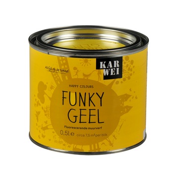 De KARWEI Happy Colours accentverf zijdeglans funky geel fluorescerend 500 ml maakt onderdeel uit van de Happy Colours serie. Dit is een speciale lijn verven die bedoeld is voor kinderkamers. De fluorescerende accentverf is geen dekkende muurverf, maar het is een transparante verf dat heftige fluorescerende kleuraccenten aanbrengt op met name lichtkleurige ondergronden. De verf is geschikt voor muren, deuren of meubeltjes en is alleen binnenshuis te gebruiken. De verf op waterbasis droogt snel en is reukarm. Het blik bevat 500 milliliter accentverf in de kleur funky geel, dit is genoeg voor een oppervlakte van zo'n 7,5 vierkante meter. Tip: maak gebruik van sjablonen om mooie figuren aan te brengen op muren of deuren, zo geef je. De fluorescerende muurverf is ook verkrijgbaar in de knalkleuren punky roze, sparky groen en heavy oranje.