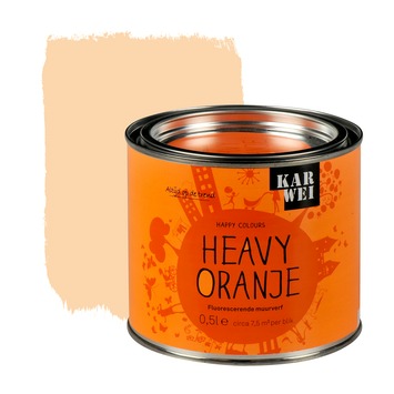 De KARWEI Happy Colours accentverf zijdeglans heavy oranje fluorescerend 500 ml maakt onderdeel uit van de Happy Colours serie. Dit is een speciale lijn verven die bedoeld is voor kinderkamers. De fluorescerende accentverf is geen dekkende muurverf, maar het is een transparante verf dat heftige fluorescerende kleuraccenten aanbrengt op met name lichtkleurige ondergronden. De verf is geschikt voor muren, deuren of meubeltjes en is alleen binnenshuis te gebruiken. De verf op waterbasis droogt snel en is reukarm. Het blik bevat 500 milliliter muurverf in de kleur heavy oranje, dit is genoeg voor een oppervlakte van zo'n 7,5 vierkante meter. Tip: maak gebruik van sjablonen om mooie figuren aan te brengen op muren of deuren, zo geef je. De fluorescerende accentverf is ook verkrijgbaar in de knalkleuren punky roze, sparky groen en funky geel.