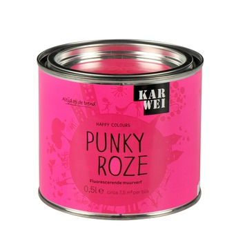 De KARWEI Happy Colours accentverf zijdeglans punky roze fluorescerend 500 ml maakt onderdeel uit van de Happy Colours serie. Dit is een speciale lijn verven die bedoeld is voor kinderkamers. De fluorescerende accentverf is geen dekkende muurverf, maar het is een transparante verf dat heftige fluorescerende kleuraccenten aanbrengt op met name lichtkleurige ondergronden. De verf is geschikt voor muren, deuren of meubeltjes en is alleen binnenshuis te gebruiken. De verf op waterbasis droogt snel en is reukarm. Het blik bevat 500 milliliter accentverf in de kleur punky roze, dit is genoeg voor een oppervlakte van zo'n 7,5 vierkante meter. Tip: maak gebruik van sjablonen om mooie figuren aan te brengen op muren of deuren, zo geef je. De fluorescerende muurverf is ook verkrijgbaar in de knalkleuren heavy oranje, sparky groen en funky geel.