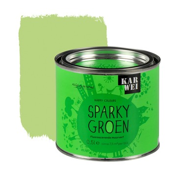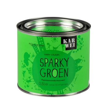 De KARWEI Happy Colours accentverf zijdeglans sparky groen fluorescerend 500 ml maakt onderdeel uit van de Happy Colours serie. Dit is een speciale lijn verven die bedoeld is voor kinderkamers. De fluorescerende accentverf is geen dekkende muurverf, maar het is een transparante verf dat heftige fluorescerende kleuraccenten aanbrengt op met name lichtkleurige ondergronden. De verf is geschikt voor muren, deuren of meubeltjes en is alleen binnenshuis te gebruiken. De verf op waterbasis droogt snel en is reukarm. Het blik bevat 500 milliliter accentverf in de kleur sparky groen, dit is genoeg voor een oppervlakte van zo'n 7,5 vierkante meter. Tip: maak gebruik van sjablonen om mooie figuren aan te brengen op muren of deuren, zo geef je. De fluorescerende muurverf is ook verkrijgbaar in de knalkleuren punky roze, heavy oranje en funky geel.