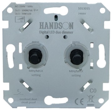 De KARWEI LED Duodimmer (230VAC/50Hz, 2x1-100W/VA) is een fase-afsnij dimmer (‘R,C’). Dit betekent dat deze dimmer geschikt is om naast dimbare Led, halogeen- en gloeilampen ook elektronische transformatoren en Led drivers te dimmen (mits deze dimbaar zijn en voorzien van de juiste specificaties t.b.v. de toepassing). Door het kunnen instellen van de minimale en maximale stand van de lamp is het dimbereik per dimmerkanaal onafhankelijk in te stellen op elke aangesloten geschikte dimbare lichtbron.