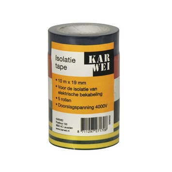 De KARWEI isolatietape 10mx19mm divers 5 stuks is een set isolatietapes in diverse kleuren van het KARWEI eigen merk. De isolatietape is geschikt voor de isolatie van elektrische bekabeling in de bijpassende kleur en heeft een doorslagspanning van 4000V.