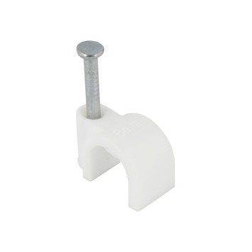 Witte kabelclip rond. Voor het vastzetten van kabels langs plinten of andere houten delen