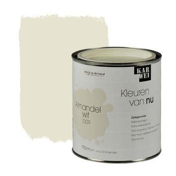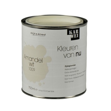 De KARWEI Kleuren van Nu lak zijdeglans amandelwit 750 ml maakt onderdeel uit van een uitgebreid actueel kleurenpallet volgens de laatste trends. De zijdeglanzende lak behoudt zijn kleur, ook in donkere ruimtes. De lak op waterbasis droogt snel en is reukarm. De lak is krasvast en is met name bedoeld voor gebruik binnenshuis. Het is geschikt voor zowel deuren als kozijnen, maar je kunt het ook gebruiken op meubelen of voor andere decoratieve toepassingen. Het blik bevat 750 milliliter amandelwitte lak, dit is genoeg voor een oppervlakte van 12 vierkante meter. Door de optimale dekking en vloeiing van de lak bereik je snel het gewenste resultaat. De lak kan eenvoudig worden aangebracht met een kwast of roller.