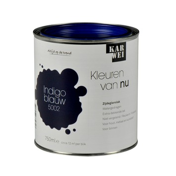 De KARWEI Kleuren van Nu lak zijdeglans indigoblauw 750 ml maakt onderdeel uit van een uitgebreid actueel kleurenpallet volgens de laatste trends. De zijdeglanzende lak behoudt zijn kleur, ook in donkere ruimtes. De lak op waterbasis droogt snel en is reukarm. De lak is krasvast en is met name bedoeld voor gebruik binnenshuis. Het is geschikt voor zowel deuren als kozijnen, maar je kunt het ook gebruiken op meubelen of voor andere decoratieve toepassingen. Het blik bevat 750 milliliter indigoblauwe lak, dit is genoeg voor een oppervlakte van 12 vierkante meter. Door de optimale dekking en vloeiing van de lak bereik je snel het gewenste resultaat. De lak kan eenvoudig worden aangebracht met een kwast of roller.