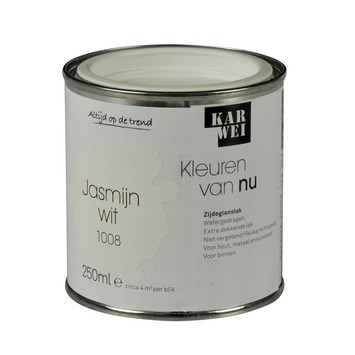 De KARWEI Kleuren van Nu lak zijdeglans jasmijnwit 250 ml maakt onderdeel uit van een uitgebreid actueel kleurenpallet volgens de laatste trends. De zijdeglanzende lak behoudt zijn kleur, ook in donkere ruimtes. De lak op waterbasis droogt snel en is reukarm. De lak is krasvast en is met name bedoeld voor gebruik binnenshuis. Het is geschikt voor zowel deuren als kozijnen, maar je kunt het ook gebruiken op meubelen of voor andere decoratieve toepassingen. Het blik bevat 250 milliliter jasmijnwitte lak, dit is genoeg voor een oppervlakte van 4 vierkante meter. Door de optimale dekking en vloeiing van de lak bereik je snel het gewenste resultaat. De lak kan eenvoudig worden aangebracht met een kwast of roller.