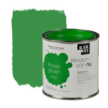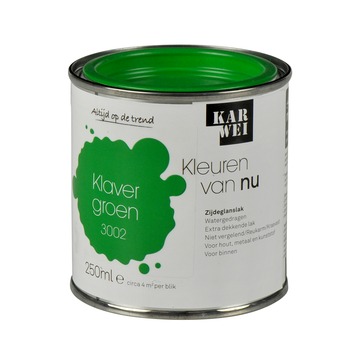 De KARWEI Kleuren van Nu lak zijdeglans klavergroen 250 ml maakt onderdeel uit van een uitgebreid actueel kleurenpallet volgens de laatste trends. De zijdeglanzende lak behoudt zijn kleur, ook in donkere ruimtes. De lak op waterbasis droogt snel en is reukarm. De lak is krasvast en is met name bedoeld voor gebruik binnenshuis. Het is geschikt voor zowel deuren als kozijnen, maar je kunt het ook gebruiken op meubelen of voor andere decoratieve toepassingen. Het blik bevat 250 milliliter klavergroene lak, dit is genoeg voor een oppervlakte van 4 vierkante meter. Door de optimale dekking en vloeiing van de lak bereik je snel het gewenste resultaat. De lak kan eenvoudig worden aangebracht met een kwast of roller.